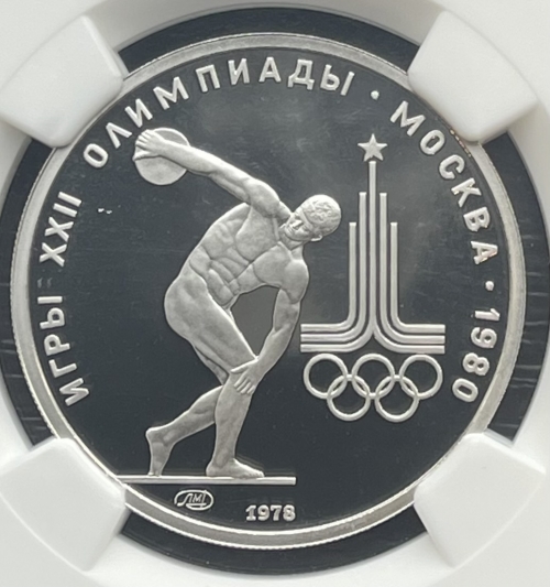Слева и сверху вдоль канта слова «ИГРЫ XXII ОЛИМПИАДЫ», справа разделенные точкой слово «МОСКВА» и год проведения XXII Олимпиады «1980», в середине слева атлет, метающий диск, справа эмблема XXII Олимпийских игр, под дискоболом монограмма монетного двора «ЛМД», внизу у канта год выпуска монеты «1978».