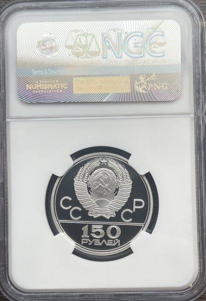 Сверху герб СССР с 15 витками ленты, слева от него буквы «СС», справа «СР», ниже двойная черта, под ней обозначение достоинства монеты цифра «150» и ниже слово «РУБЛЕЙ».