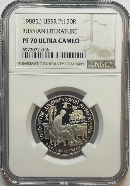 Сверху герб СССР с 15 витками ленты, под ним буквы «СССР», ниже слева и справа черта, под чертой слева химическое обозначение «Pt» и проба «999» металла из которого сделана монета, под ними чистый вес драгоценного металла «15,55», под чертой справа монограмма монетного двора «ЛМД», ниже обозначение достоинства монеты цифра «150» и ниже слово «РУБЛЕЙ», внизу у канта год выпуска монеты «1988».