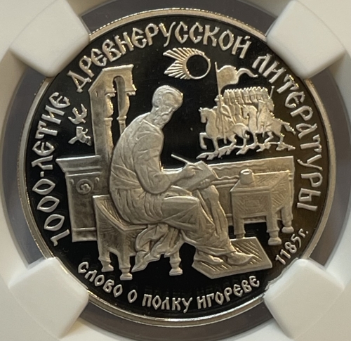 Сверху вдоль канта слова «1000-ЛЕТИЕ ДРЕВНЕРУССКОЙ ЛИТЕРАТУРЫ», в середине неизвестный автор создает произведение, внизу вдоль канта слова «СЛОВО О ПОЛКУ ИГОРЕВЕ» и год «1185г.».