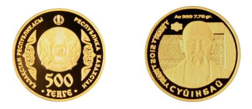 Номинал монеты 500 тенге, проба 999/1000, вес 7,78 грамм, диаметр 21,87 мм.