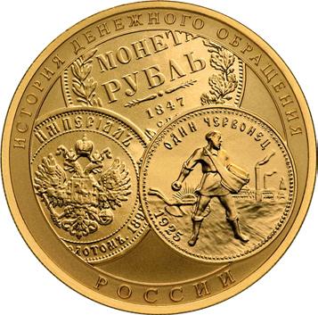 Реверс: изображения трёх монет: вверху - серебряного рубля Николая I, слева - золотого империала Николая II, справа - золотого червонца советского чекана, по окружности - надпись: "ИСТОРИЯ ДЕНЕЖНОГО ОБРАЩЕНИЯ РОССИИ".