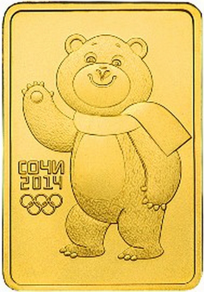 Реверс: рельефное изображение Белого Мишки - официального талисмана XXII Олимпийских зимних игр 2014 года в г. Сочи, слева от него в две строки - надпись: "СОЧИ" и дата: "2014", под ними - пять Олимпийских колец.